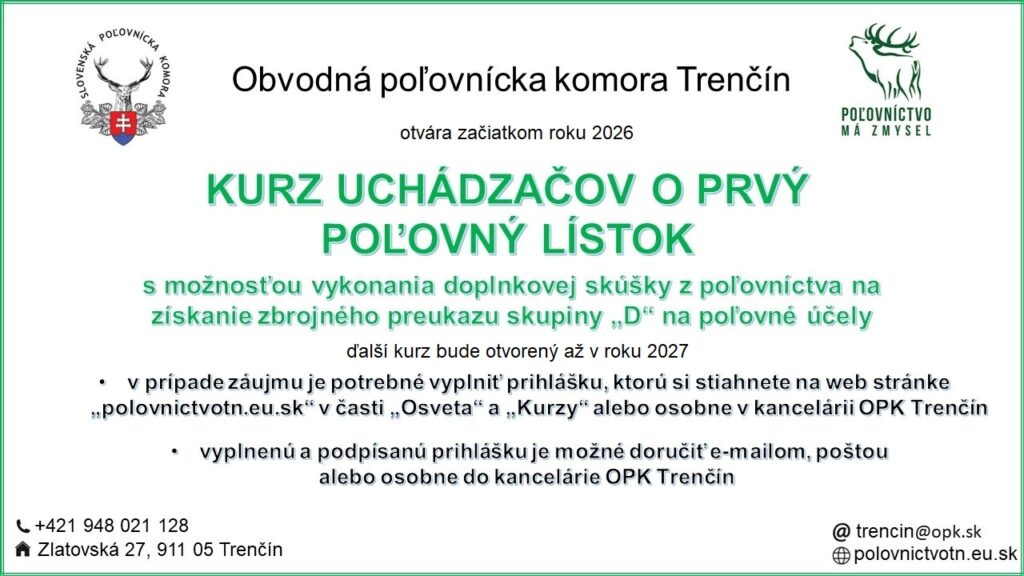 Obvodná poľovnícka komora Trenčín otvára v roku 2026 KURZ UCHÁDZAČOV O PRVÝ POĽOVNÝ LÍSTOK.