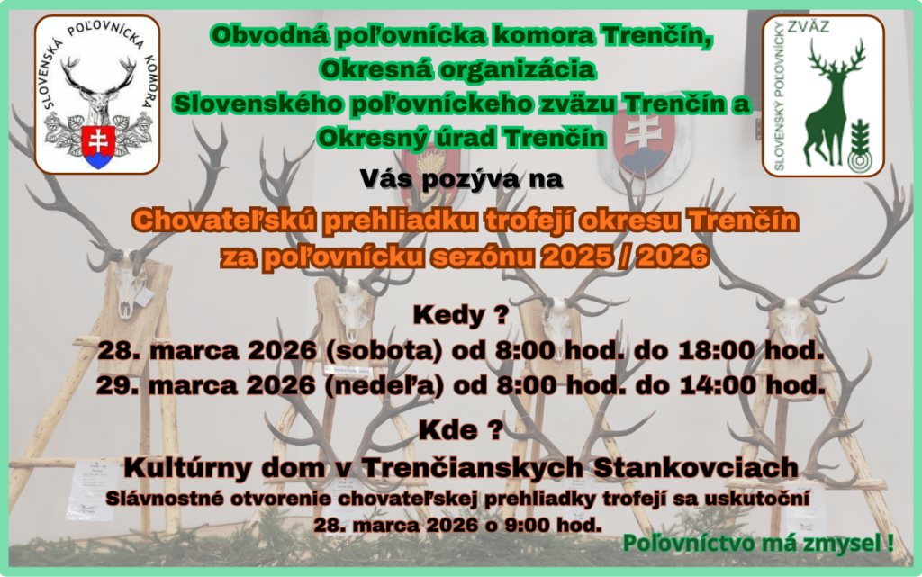 Srdečne Vás pozývame na výstavnú časť chovateľskej prehliadky trofejí ulovených v okrese Trenčín za poľovnícku sezónu 2025/2026, ktorá sa uskutoční dňa 28.03.2026 (sobota) od 08:00 – 18:00 hod. a 29.03.2026 (nedeľa) od 08:00 – 14:00 hod. v Kultúrnospoločenskom dome v Trenčianskych Stankovciach. Slávnostné otvorenie chovateľskej prehliadky bude dňa 29.03.2026 o 09:00 hod.