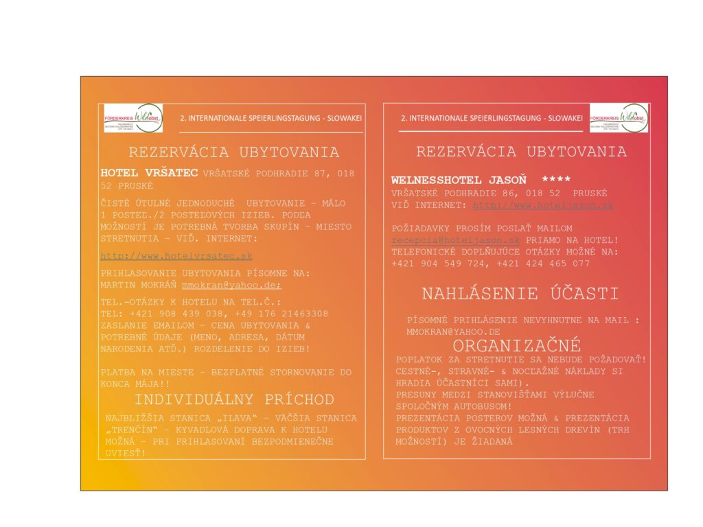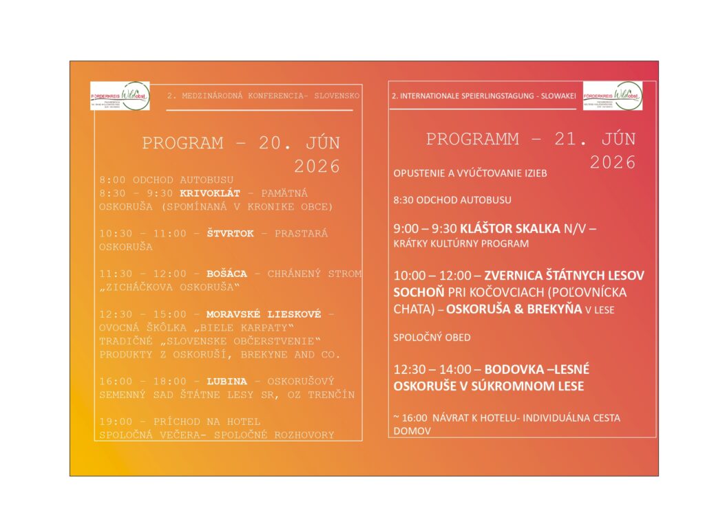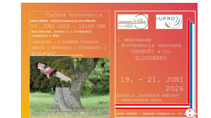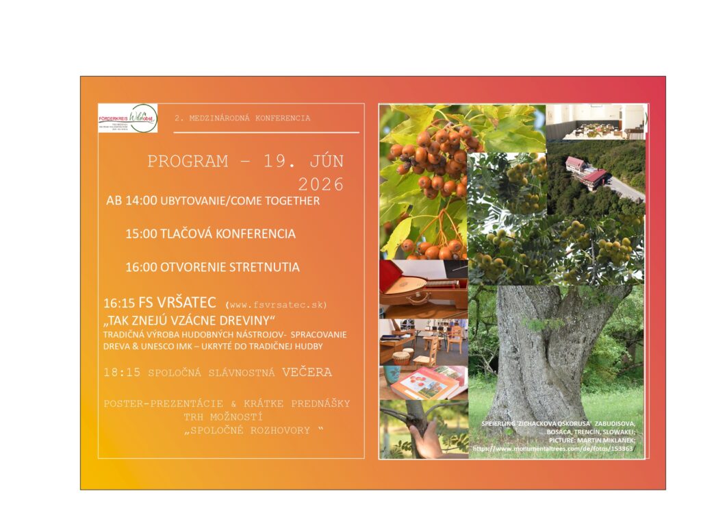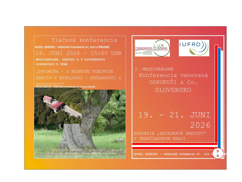 dovoľujeme si Vás pozvať na medzinárodnú prírodovedeckú konferenciu, ktorá sa bude konať v dňoch 19. – 21.6.2026 v hoteli Vršatec. V rámci programu budú navštívené rôzne lokality Trenčianskeho kraja. Podujatie organizuje rakúsky spolok Förderkreis Wildobst. Tento spolok je členom IUFRO – medzinárodnej Únie združujúcej lesnícke výskumné organizácie. Konferencia bude venovaná využitiu vzácnych lesných drevín, predovšetkým jarabiny oskorušovej. Účastníkov čaká bohatý program priamo v hoteli, ako ja na rôznych lokalitách v teréne.