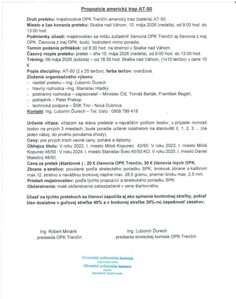 pozývame Vás na Majstrovstvá OPK TN v poľovníckej disciplíne AT-50, ktoré sa budú konať dňa 10.05.2026 so začiatkom o 09:00 hod. na strelnici v Skalke nad Váhom. Viac informácii v priložených propozíciách súťaže.